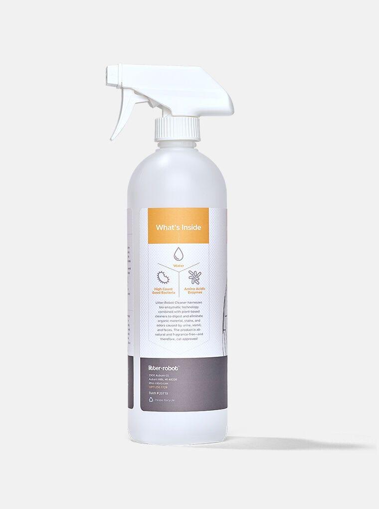 - Contents of the enzymatic cleaner spray are all natural; packaging may not be. Product labels may contain more and/or different information from the product information listed on the website. You should always read labels, warnings, directions, and other information provided with the product before using or allowing your pet to consume a product. Any applications other than those described on the product label are not approved or endorsed by Whisker or Litter-Robot.com. Litter-Robot.com is not responsible for accidents, illnesses, or injuries that occur from use of these products.