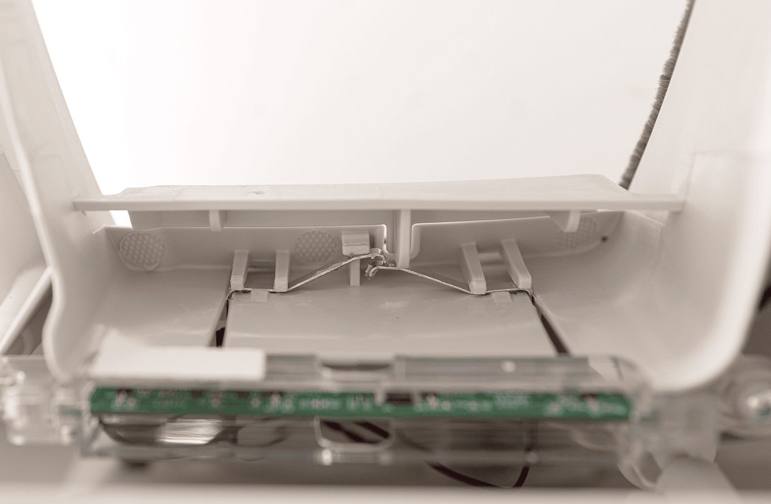 - Regardez en haut de la base et localisez la barre de pincement en plastique sur le côté gauche de l'ouverture du port de déchets.