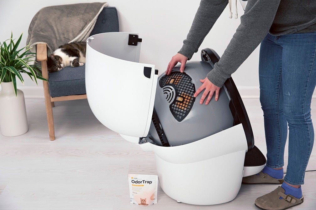 Litter-Robot 4 est équipé d'un filtre à charbon installé à l'extérieur du globe. Lorsque le globe est en position d'accueil, le filtre repose directement sur le tiroir à déchets pour absorber les odeurs.