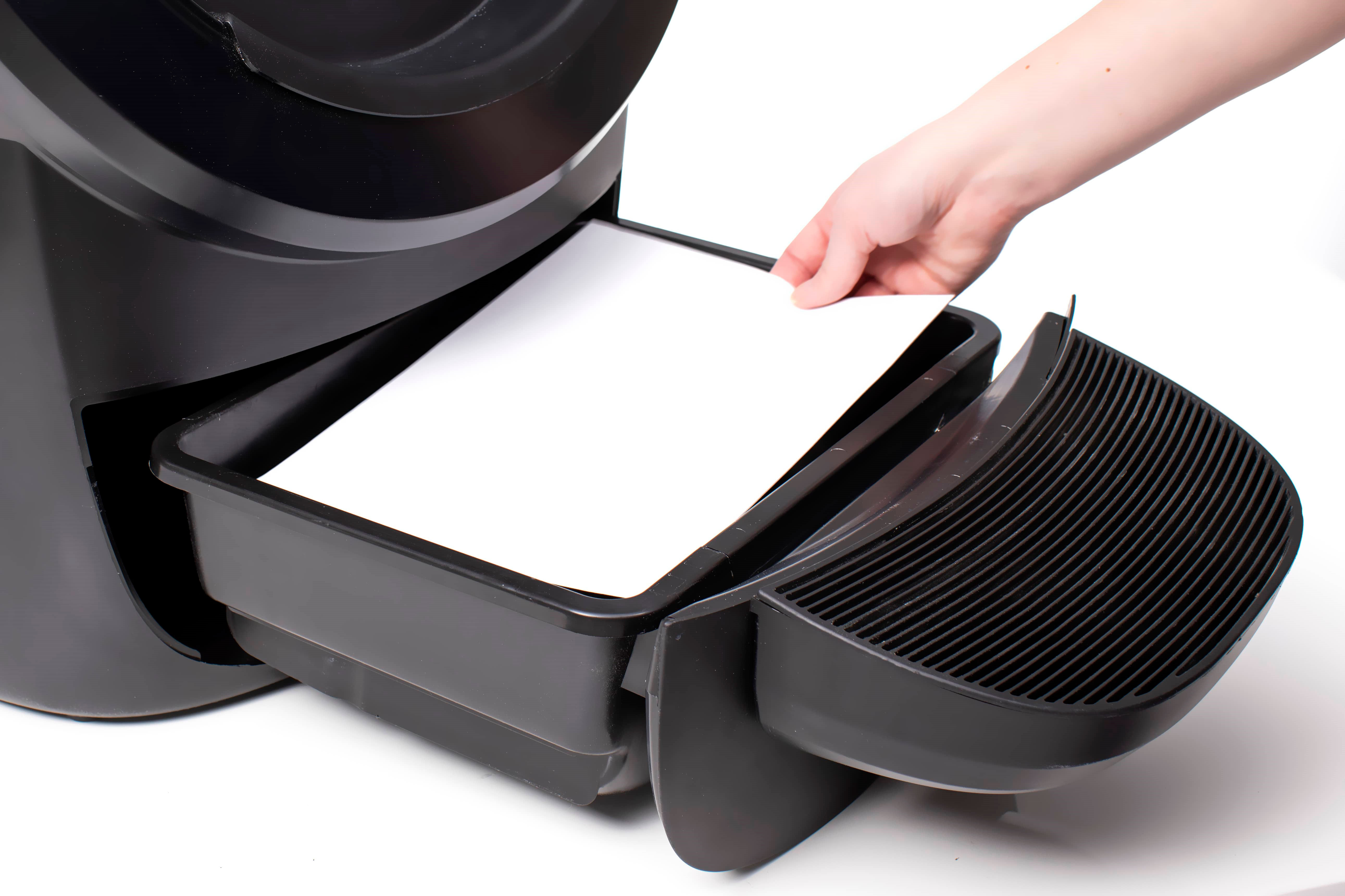 - Placez la carte de recalibrage Litter-Robot 4 de votre kit de bienvenue au fond du tiroir, face vierge vers le haut. (Litter-Robot 4 est spécifiquement calibré pour la nuance de gris sur cette carte.)