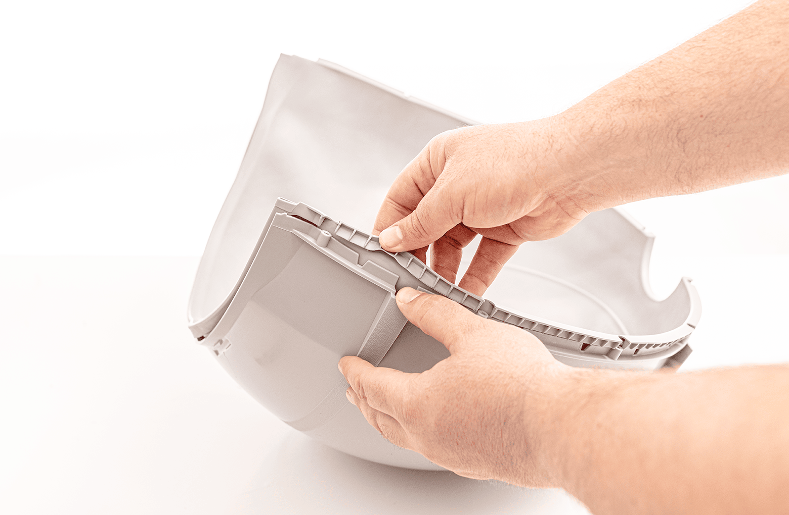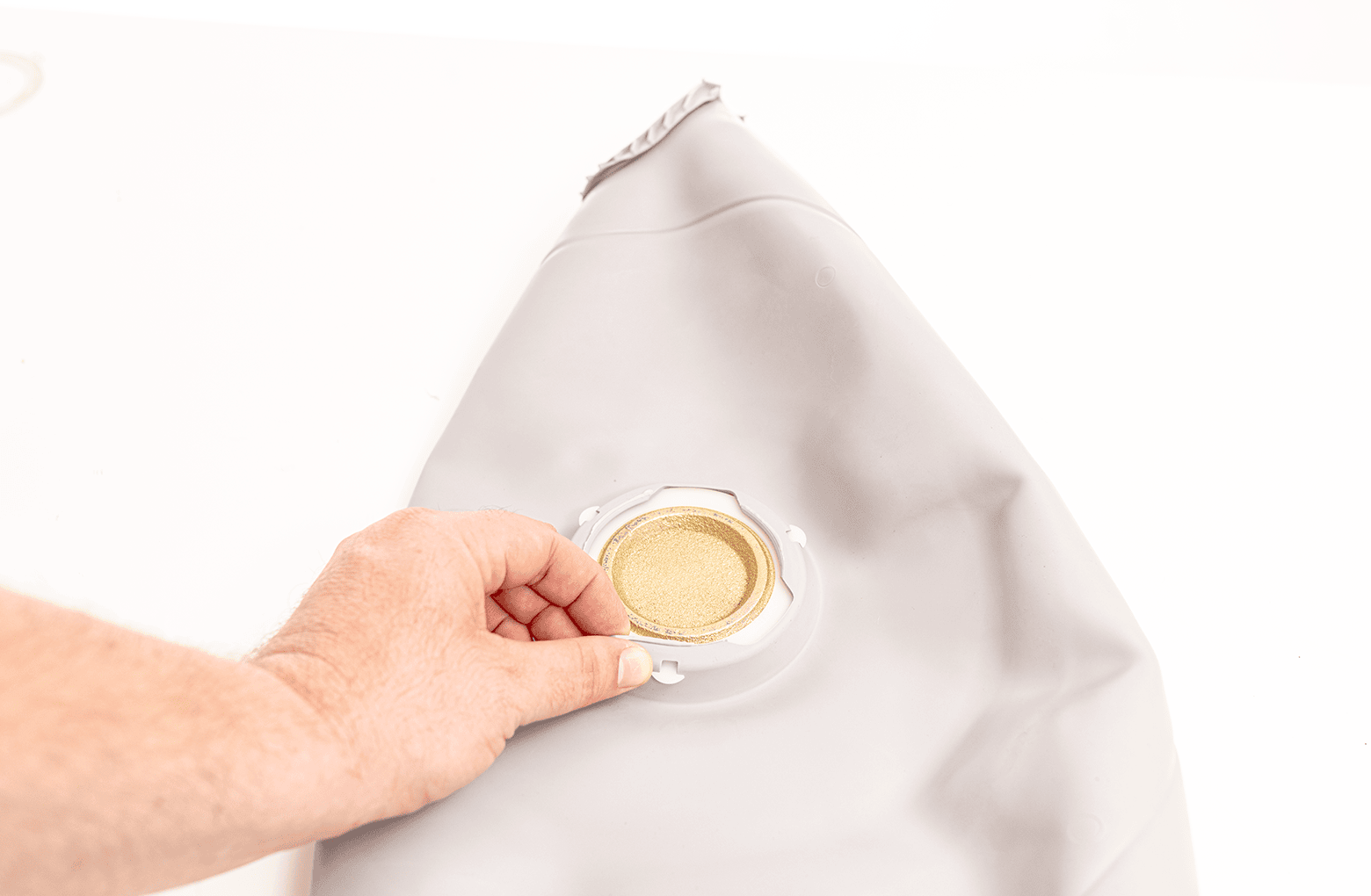 Placez le revêtement dans la moitié inférieure du globe. En commençant par une extrémité, parcourez le périmètre en appuyant la doublure sur le bord extérieur du globe. Lorsque vous atteignez le point médian, rentrez les deux doigts centraux à l’intérieur du globe, à l’extérieur de la doublure.