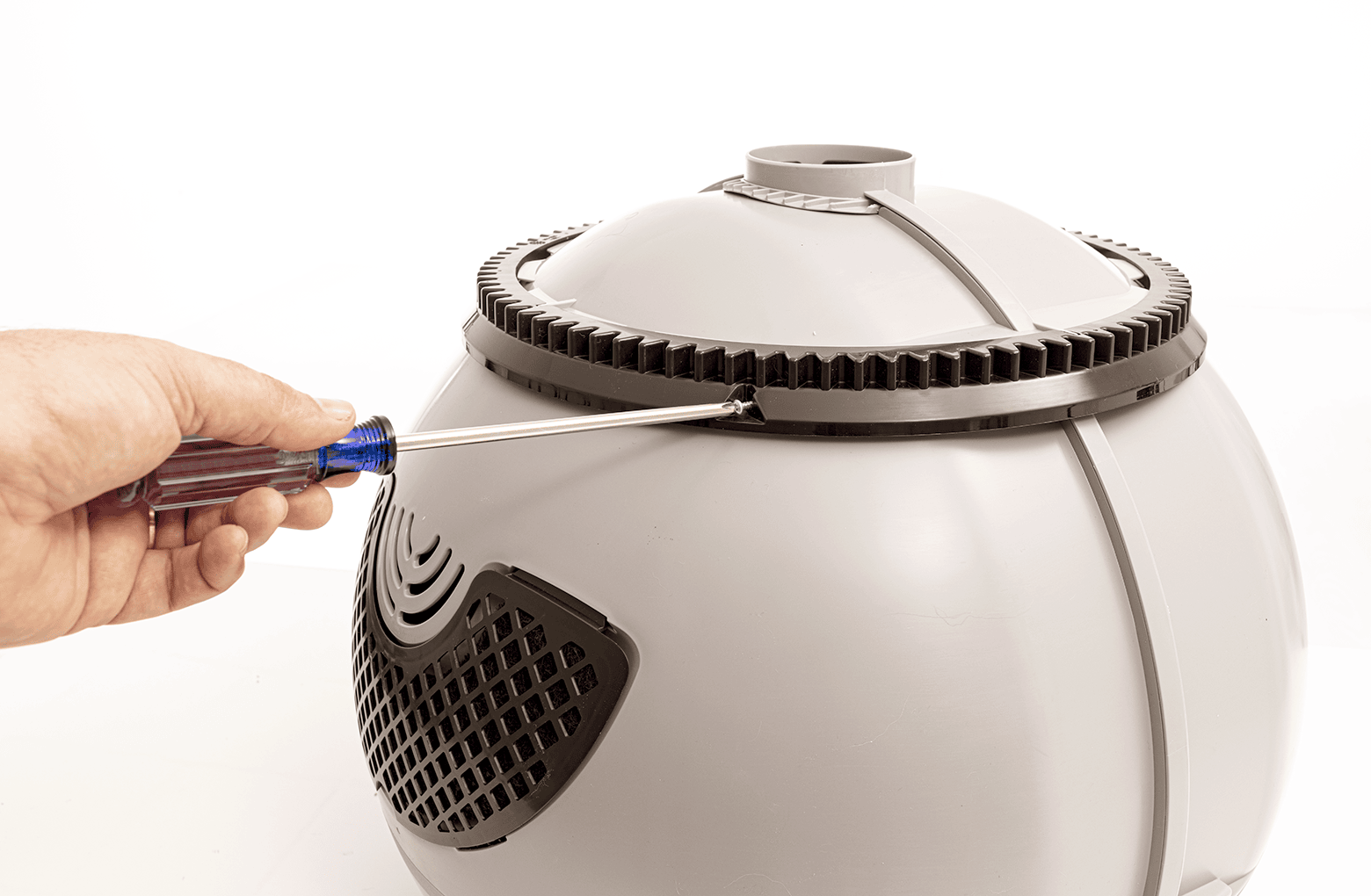 Retirez les dix (10) vis qui maintiennent ensemble les moitiés supérieure et inférieure du globe. Soulevez la moitié supérieure du globe – elle devrait maintenant se séparer de la moitié inférieure – et mettez-la de côté.