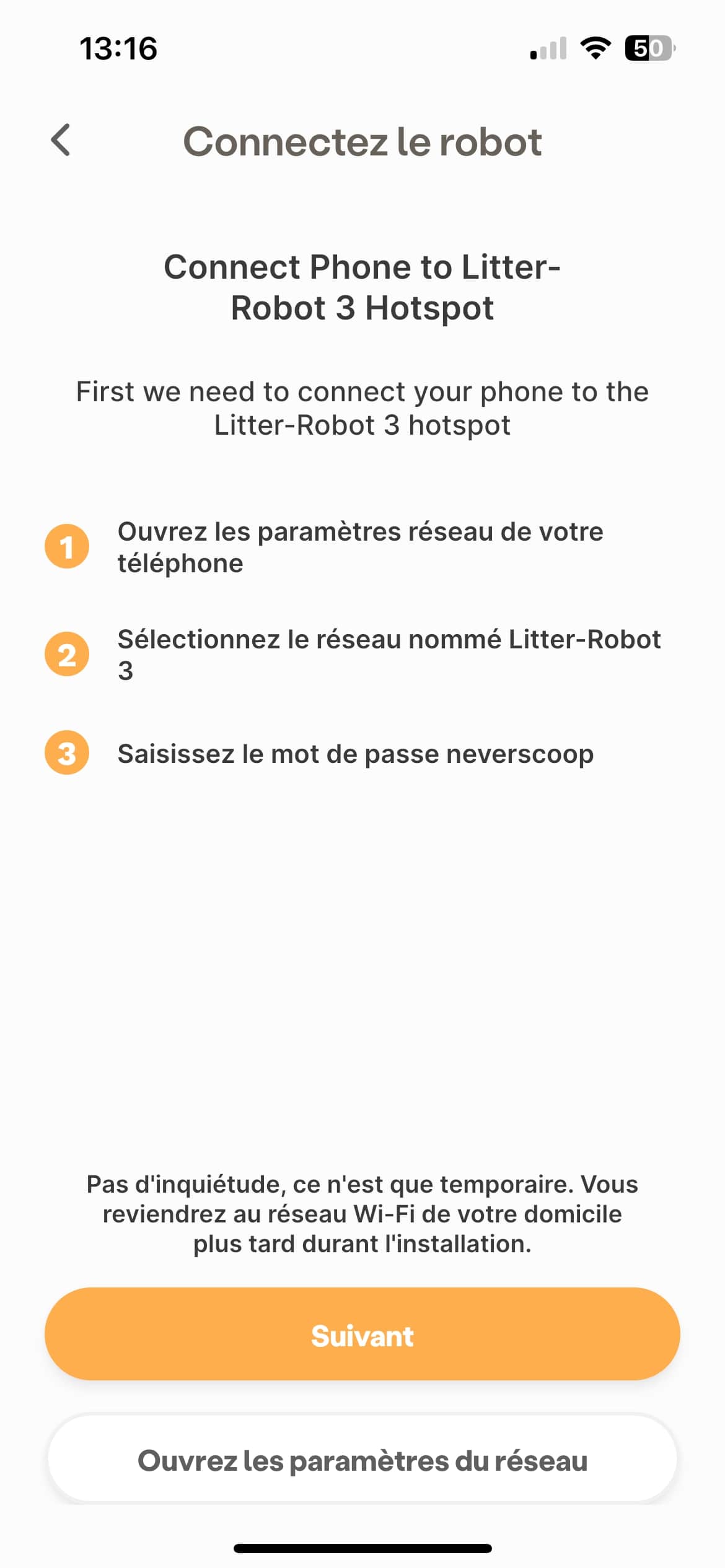 - Si l'application ne parvient pas à trouver Litter-Robot via le bluetooth de votre appareil, nous devons connecter votre téléphone au point d'accès Litter-Robot via WiFi. Ouvrez les paramètres réseau de votre téléphone. Sélectionnez le réseau nommé « Litter-Robot » et entrez le mot de passe « neverscoop »