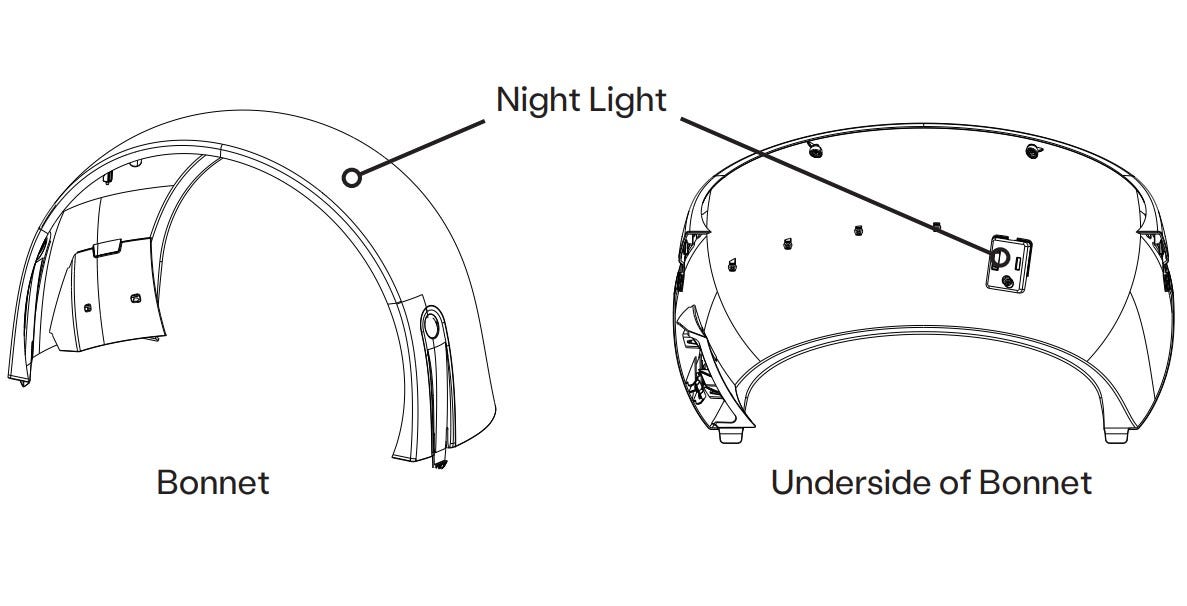 A light sensor located above the Cycle button detects ambient light and turns the night light on and off automatically.