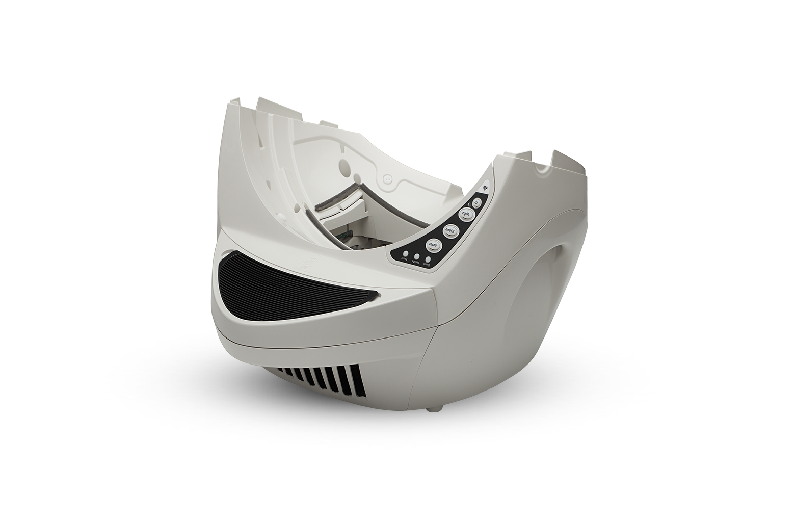 5. Um die Installation zu testen, schließen Sie das Gerät an und lassen Sie einen Reinigungszyklus laufen. Wenn der Zyklus abgeschlossen ist, drücken Sie gleichzeitig lange auf die Tasten „Cycle“ und „Empty“. Die Einschalttaste sollte weiß und dann blau aufleuchten. Dies zeigt an, dass das Gerät erfolgreich WLAN überträgt. Um den WLAN-Modus auszuschalten, drücken Sie die Reset-Taste. Jetzt können Sie eine Verbindung herstellen. Folgen Sie der Schnellstartanleitung zum Verbinden, um Ihren Litter-Robot an Bord zu nehmen und eine Verbindung zur App herzustellen.