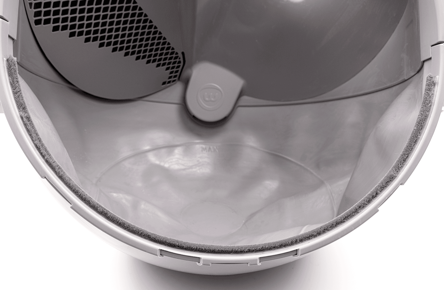 - Katzenhaare können im Dichtungsstreifen an der Vorderseite der Kugel hängen bleiben. Wenn sich die Kugel dreht, können die Haare den DFI-Sensor beeinträchtigen. Stellen Sie sicher, dass sich die Dichtungsstreifen an der Innenseite der Kugel nicht lösen oder dass sich darin Schmutz (Katzenhaare usw.) verfangen hat. Ersatzdichtungsstreifen können Sie bei Litter-Robot.com kaufen.