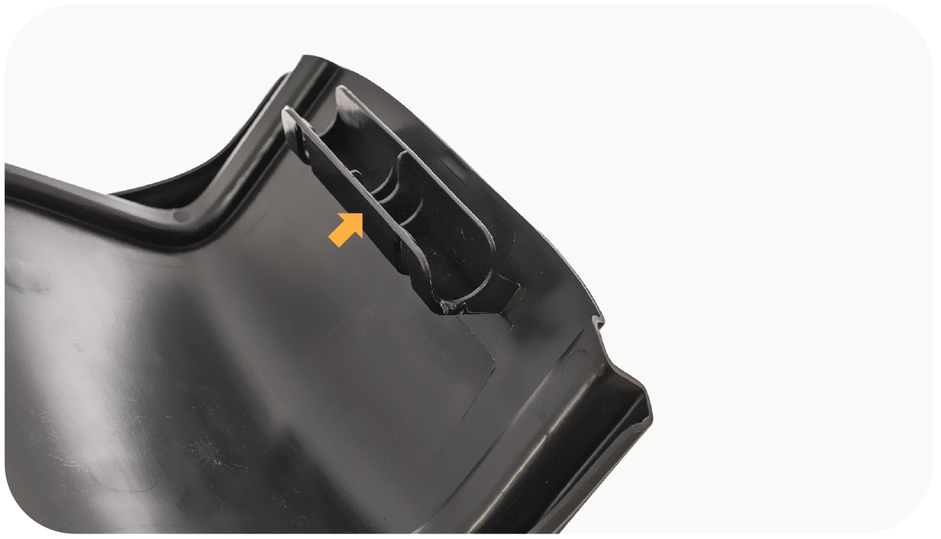 - Lassen Sie das Rampenscharnier auf der Blende einrasten, indem Sie an den gezeigten Stellen nach unten drücken, bis Sie ein Klicken hören. Stellen Sie sicher, dass beide Enden des Scharniers fest auf der Oberfläche der Blende aufliegen.