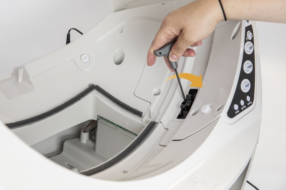 - Localisez l'engrenage droit noir sur le côté du panneau de commande de votre Litter-Robot. Appuyez sur l'engrenage. S'il bouge, vous devez serrer la vis de réglage.