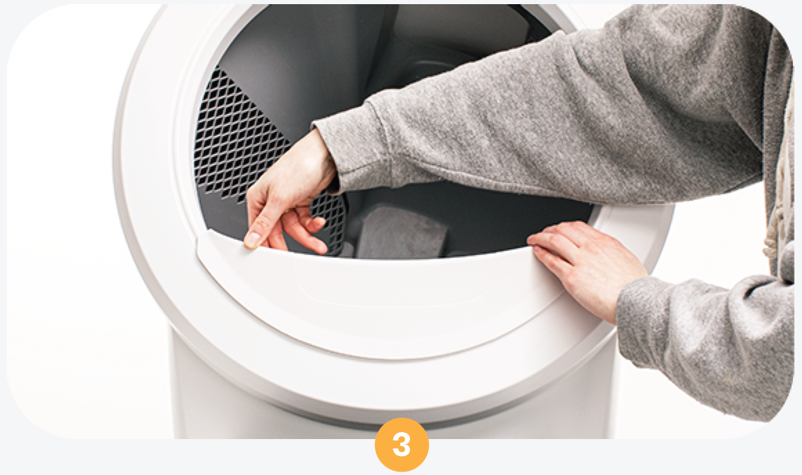 La clôture Litter-Robot 4 s'enclenche sur la lunette à l'entrée du globe et agit comme une barrière pour contenir les déchets soulevés.