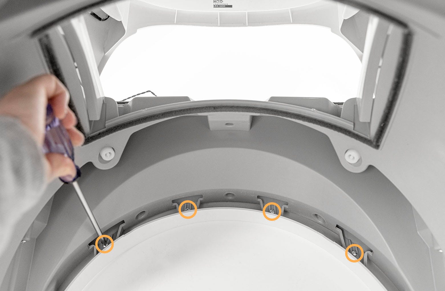 - Retirez les quatre (4) vis derrière les bandes d'étanchéité fixées à la lunette (le haut de la lunette telle qu'elle est actuellement située).