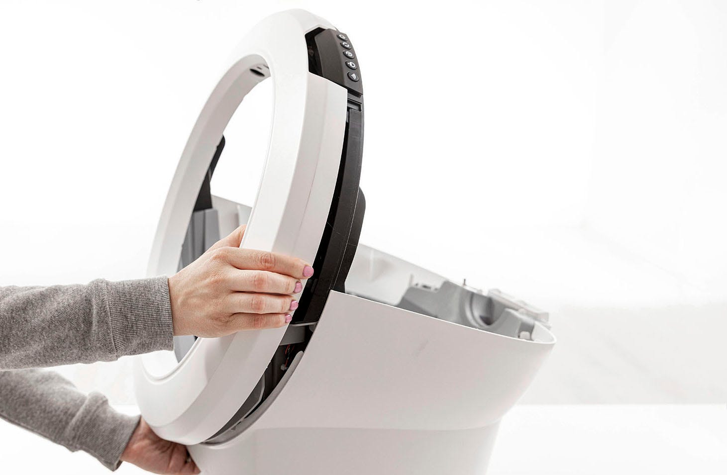 - Inclinez l'appareil à la verticale. Avec une main sur l'ouverture du tiroir de la base, tirez délicatement sur un côté de la lunette pour commencer à la séparer du pont. Tirez ensuite sur l'autre côté et retirez complètement la lunette.