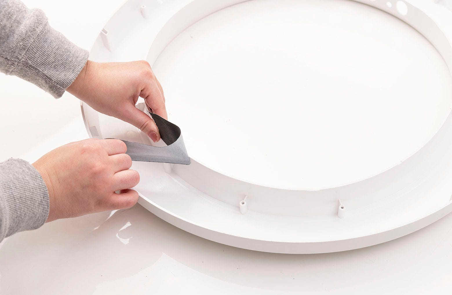 - Répétez le processus pour la deuxième bande d'étanchéité : retirez le support adhésif et placez la bande sur le côté droit de l'entrée du globe. Là encore, la bande doit être placée vers le bord avant du rebord du globe.