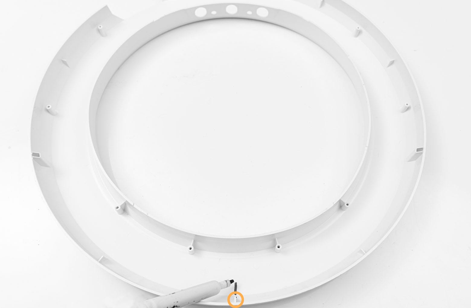 - Localisez les anciennes bandes d'étanchéité du port d'évacuation supérieur dans la base. Utilisez un couteau à mastic, un tournevis à tête plate ou votre ongle pour soulever le coin d'une bande et décoller les quatre (4) bandes.
