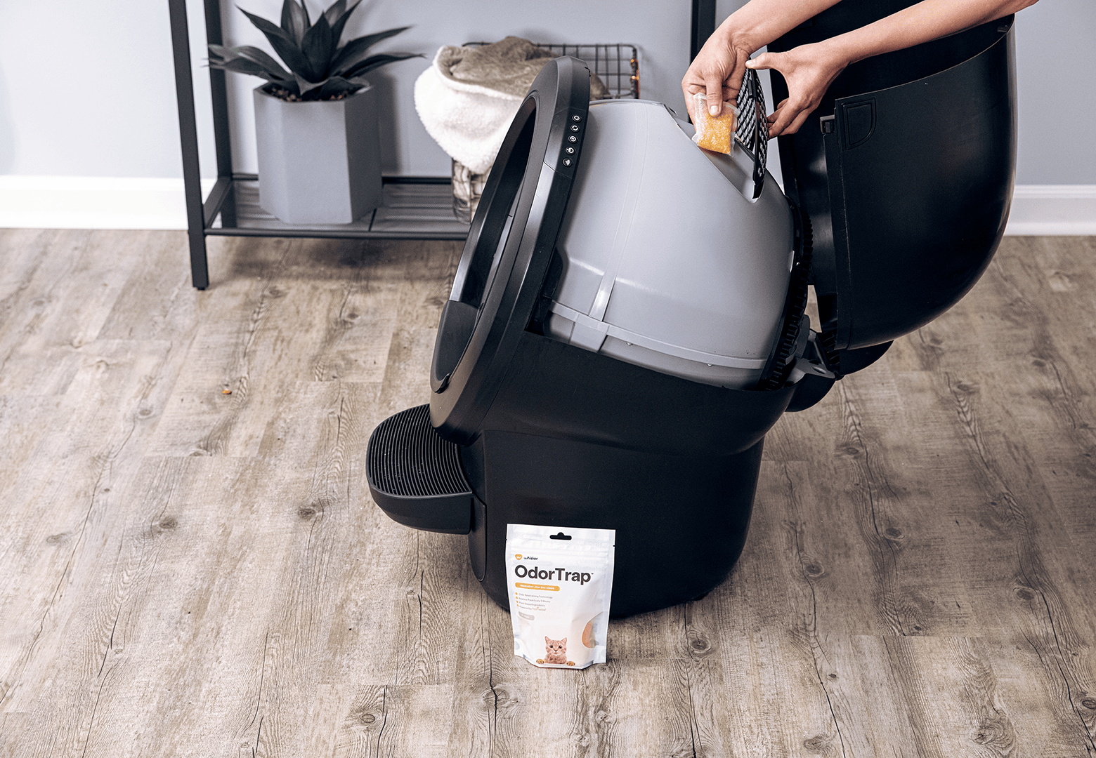 Litter-Robot 4 peut être équipé de (3) packs OdorTrap® installés sur la zone inférieure extérieure du globe. Les paquets reposent directement sur le tiroir à déchets pour éliminer les odeurs.