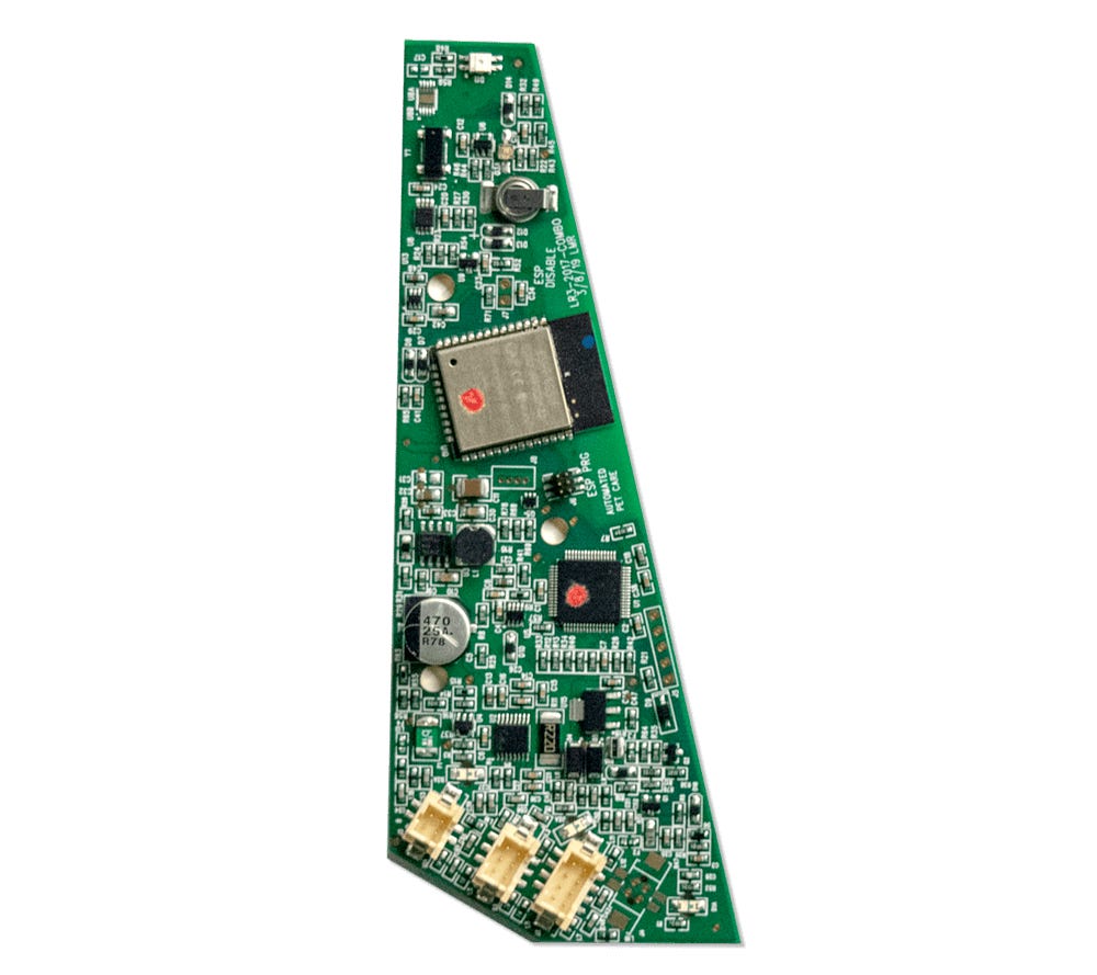 Litter-Robot 3 is equipped with a main circuit board that controls the robot's functionality. Litter-Robot 3 Connect unit's main circuit board also controls the connectivity of the robot. Within this circuit board are the main processor, WiFi connectivity chip (for connect units), ambient light sensor, as well as main harness connectors for power and other peripheral sensors or systems.