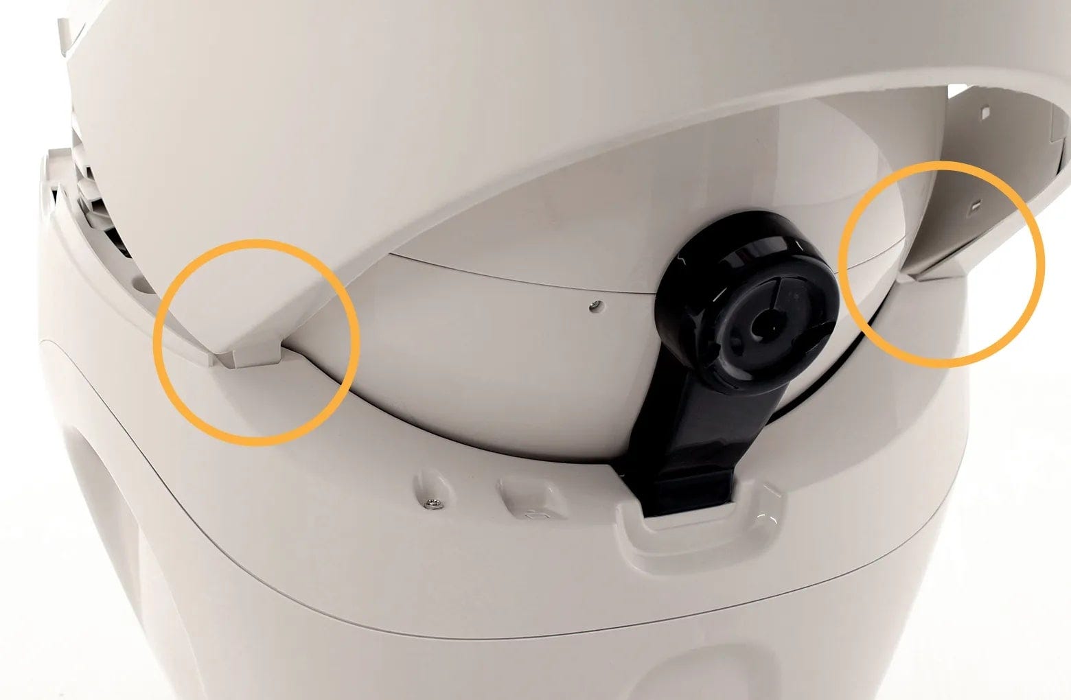Attach the Bonnet by aligning the rear tabs with the Base, tilting it forward, and snapping the side tabs into place. Ensure all four tabs are securely fastened.