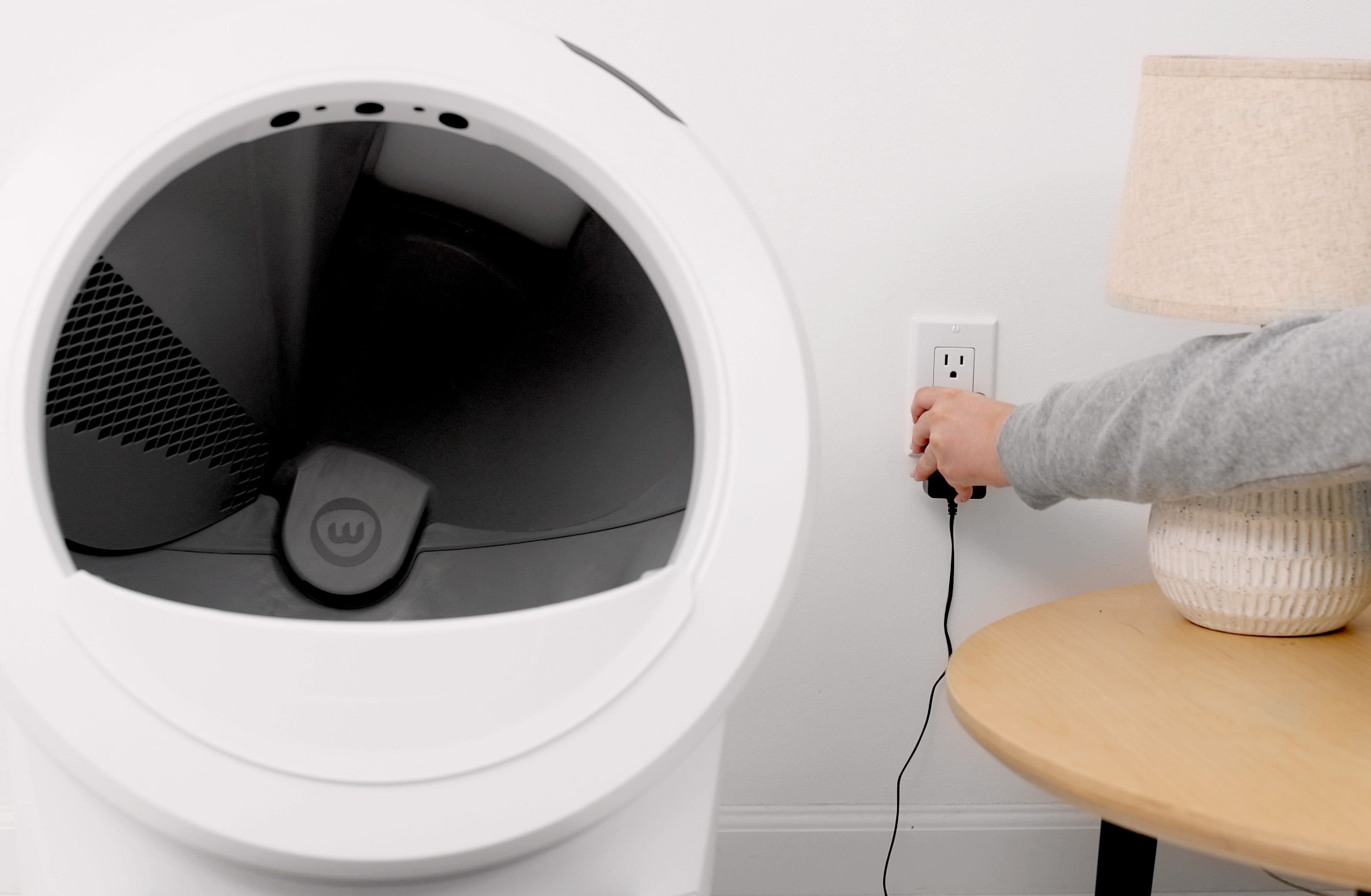 - Align the posts on the LitterHopper with the circular pockets and lower it into place to ensure a good electrical connection between the power plug and the power jack.