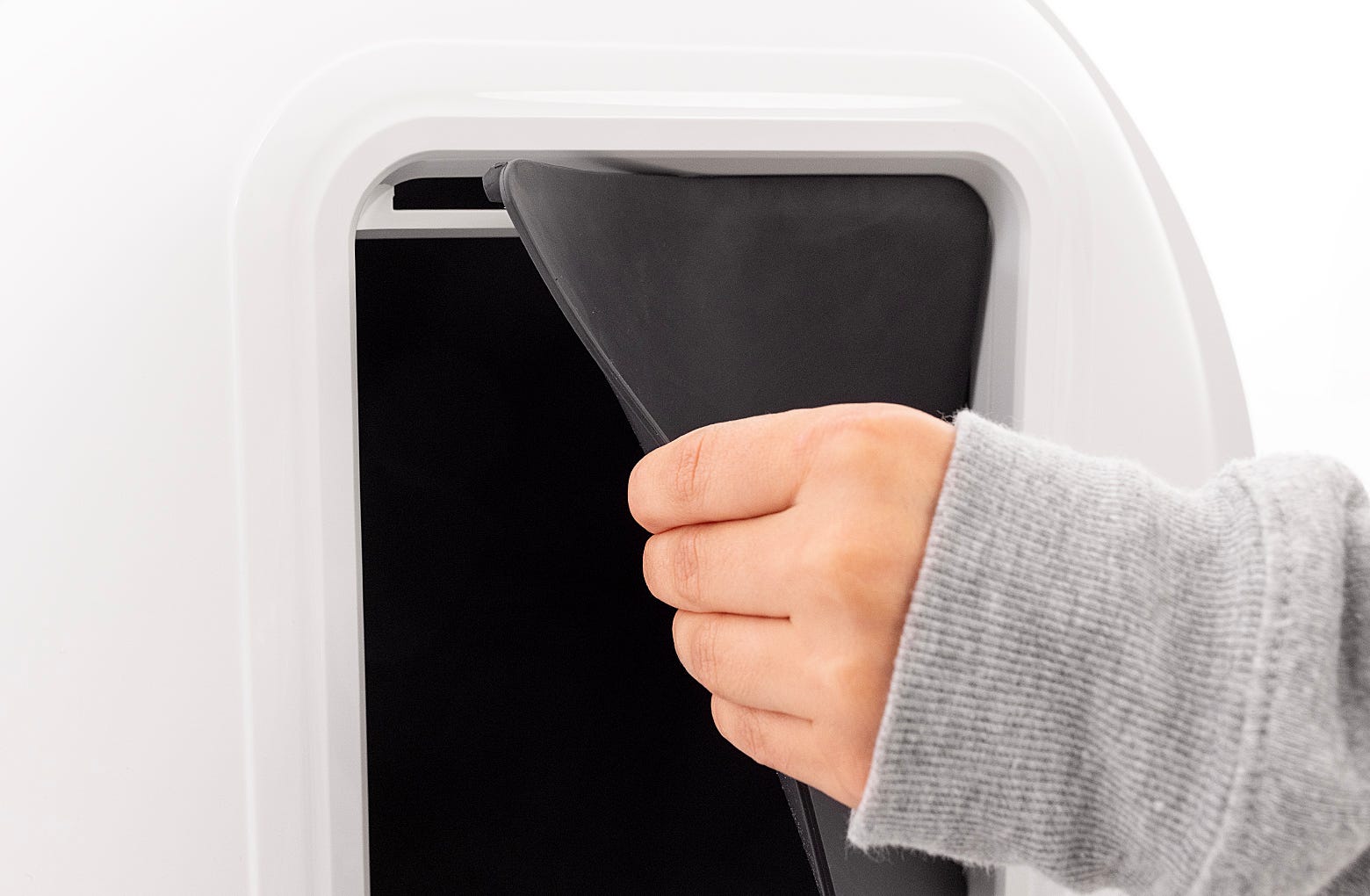 The Litter-Robot 4 Shield attaches to the front of the bezel. The shield provides your cat with added privacy while reducing odors and litter tracking. We suggest installing the shield as shipped with the flexible privacy flap unattached. This will allow your cat to become familiar with the new opening of their Litter-Robot 4. Once your cat is comfortable entering and exiting their modified Litter-Robot 4, then it is time to install the privacy flap.