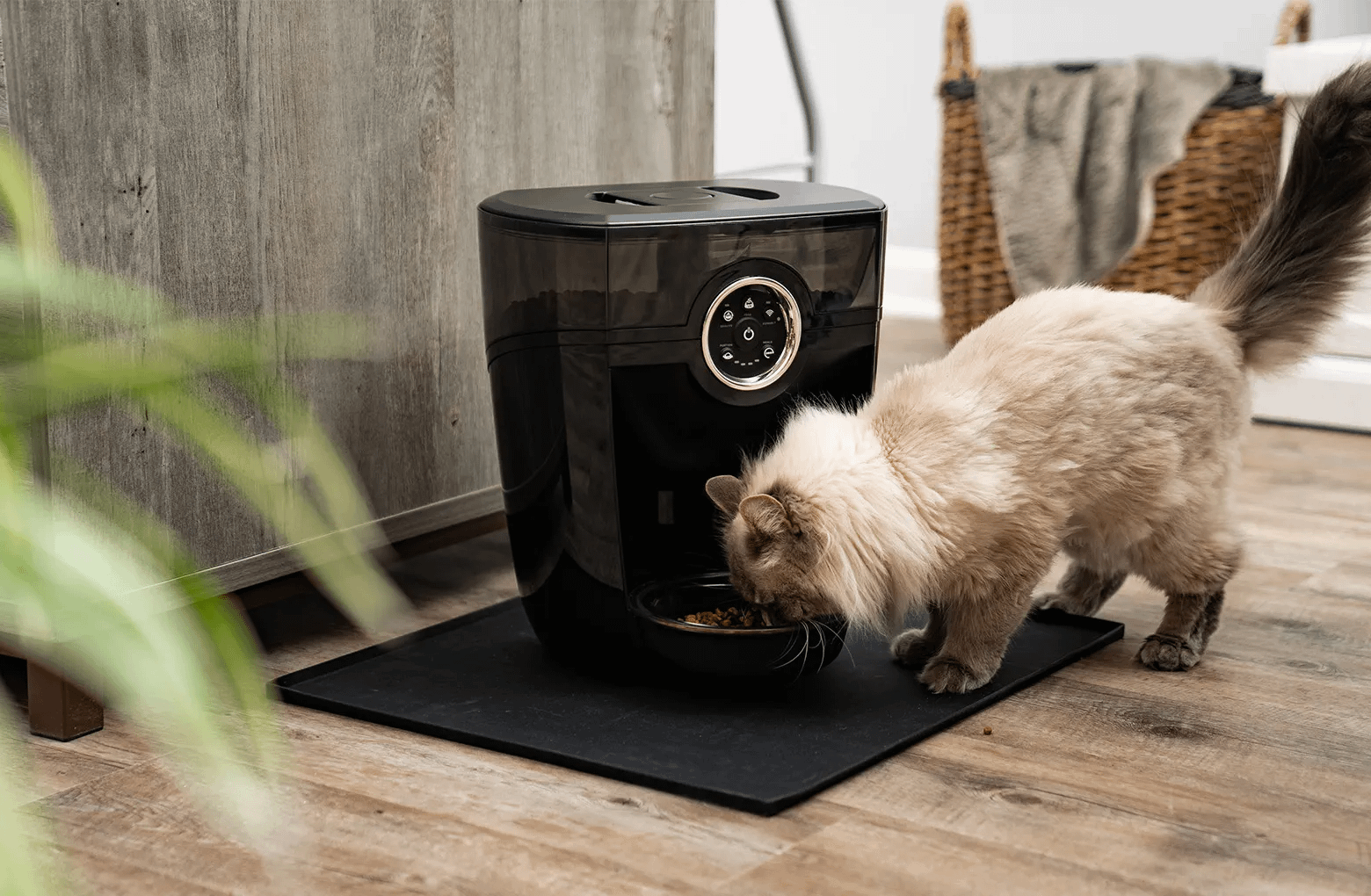 The Feeder-Robot dispenses up to 1 cup of pet food in 1/4-cup increments or up to 1/2 cup in 1/8-cup increments, 1 to 4 times per day (or up to 8 times if using the app). With the hopper insert, you can add up to 25 cups of kibble. Without the hopper insert, you can add 30-32 cups of kibble.
