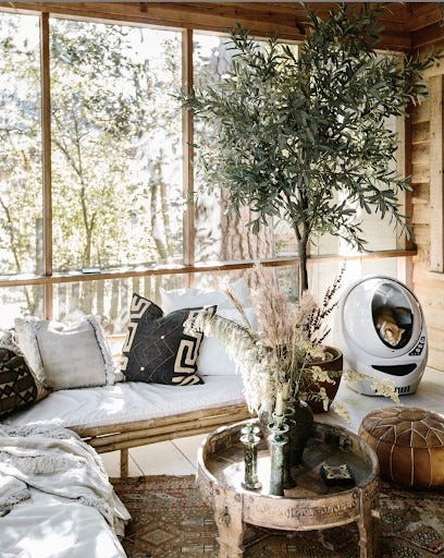 Litter-Robot 3 blends into naturalistic home design while an orange cat uses it.