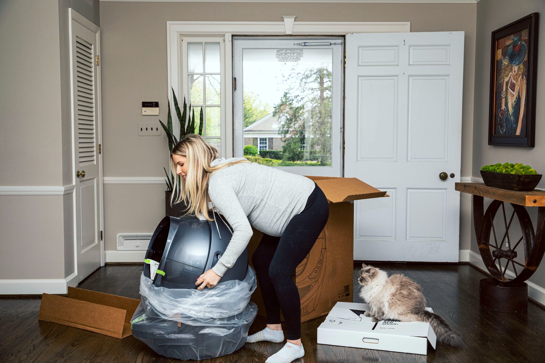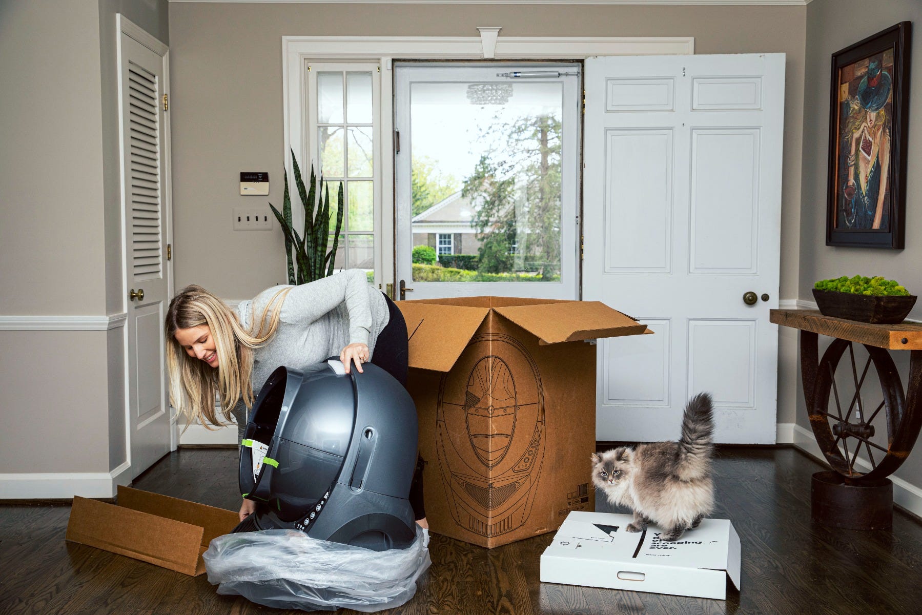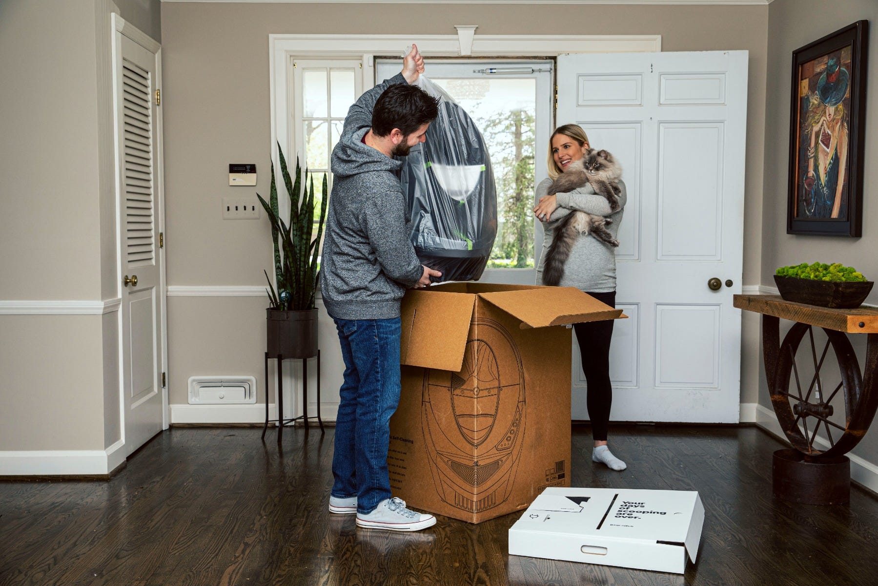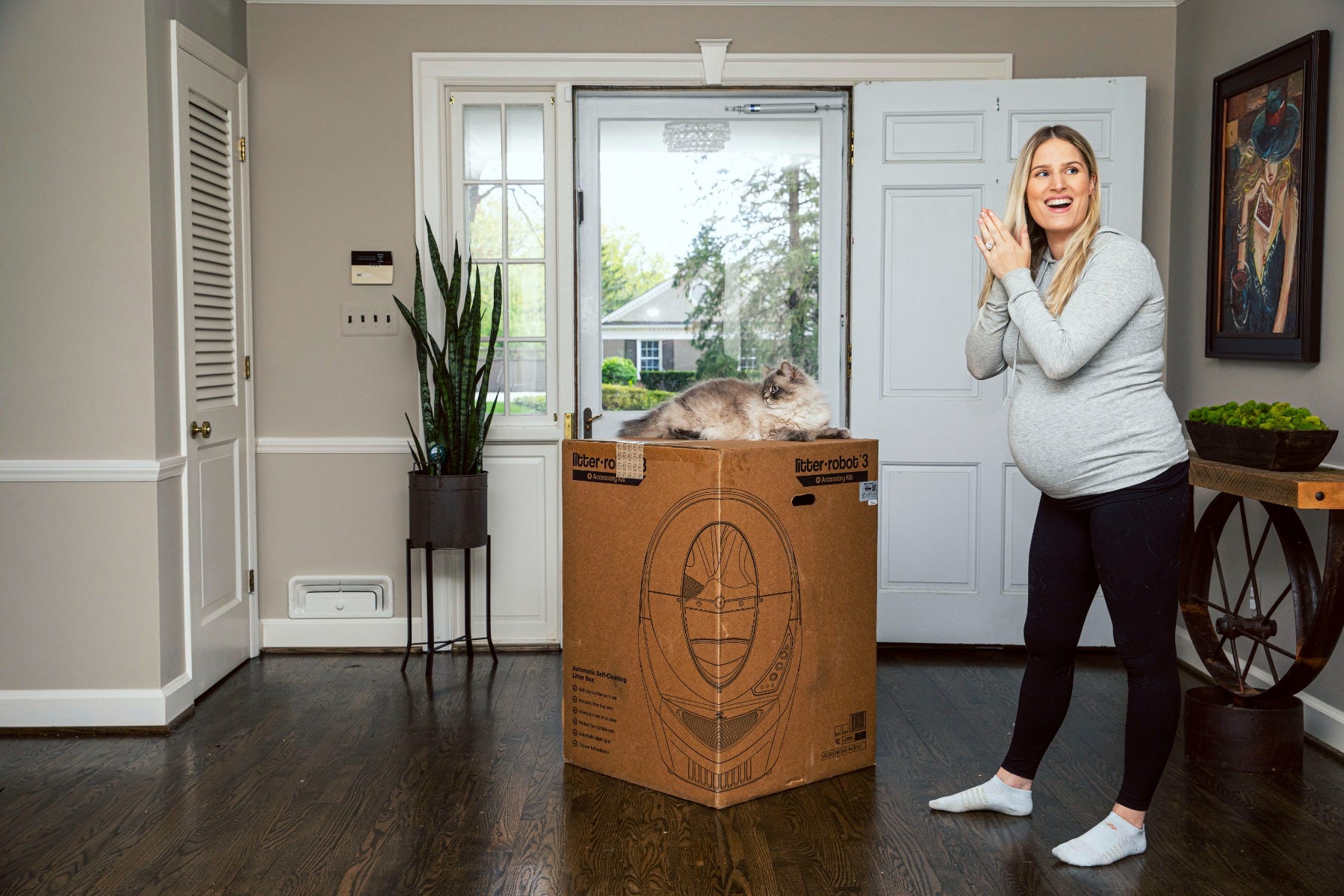 An expecting couple and their adorable cat excitedly unbox Litter-Robot 3.