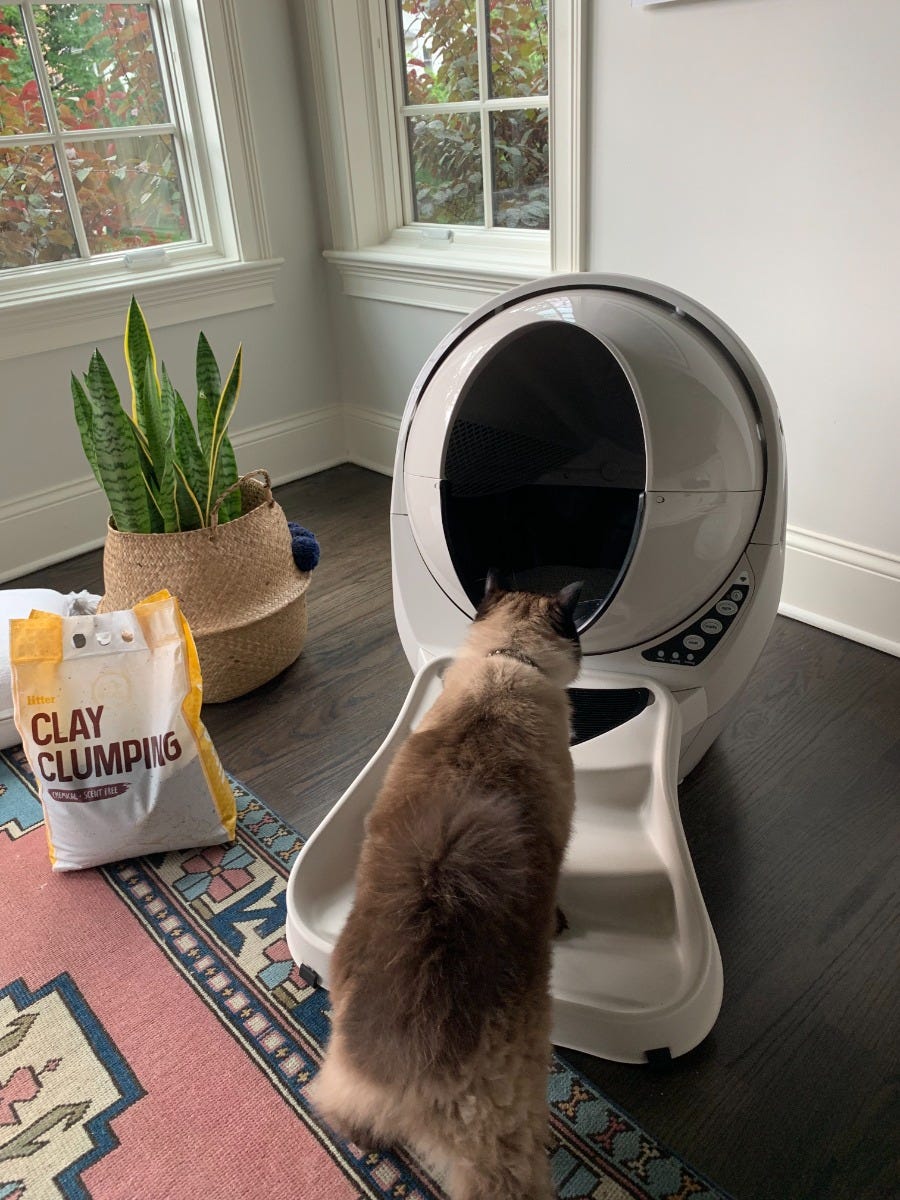 The enclosed Litter-Robot gives this Sphynx cat privacy to use the bathroom without distractions.