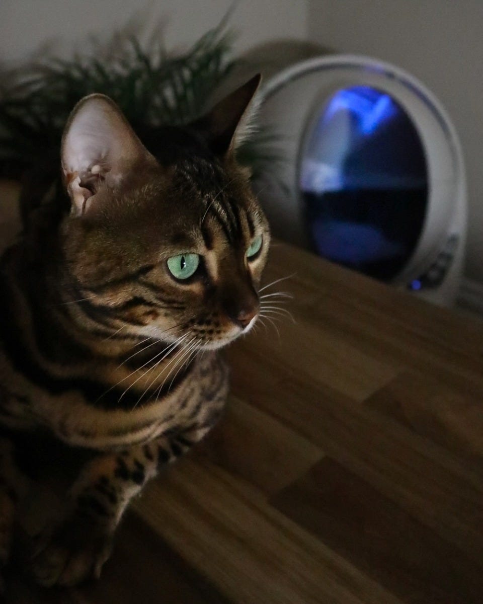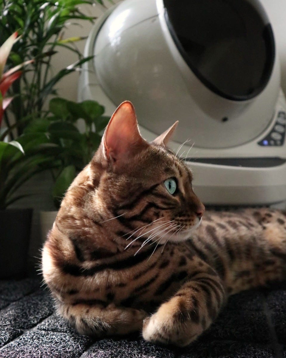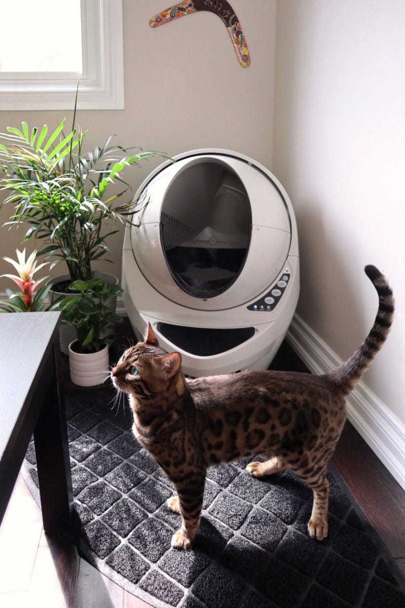 Bengal cat leaving after using Litter-Robot 3 in living room.