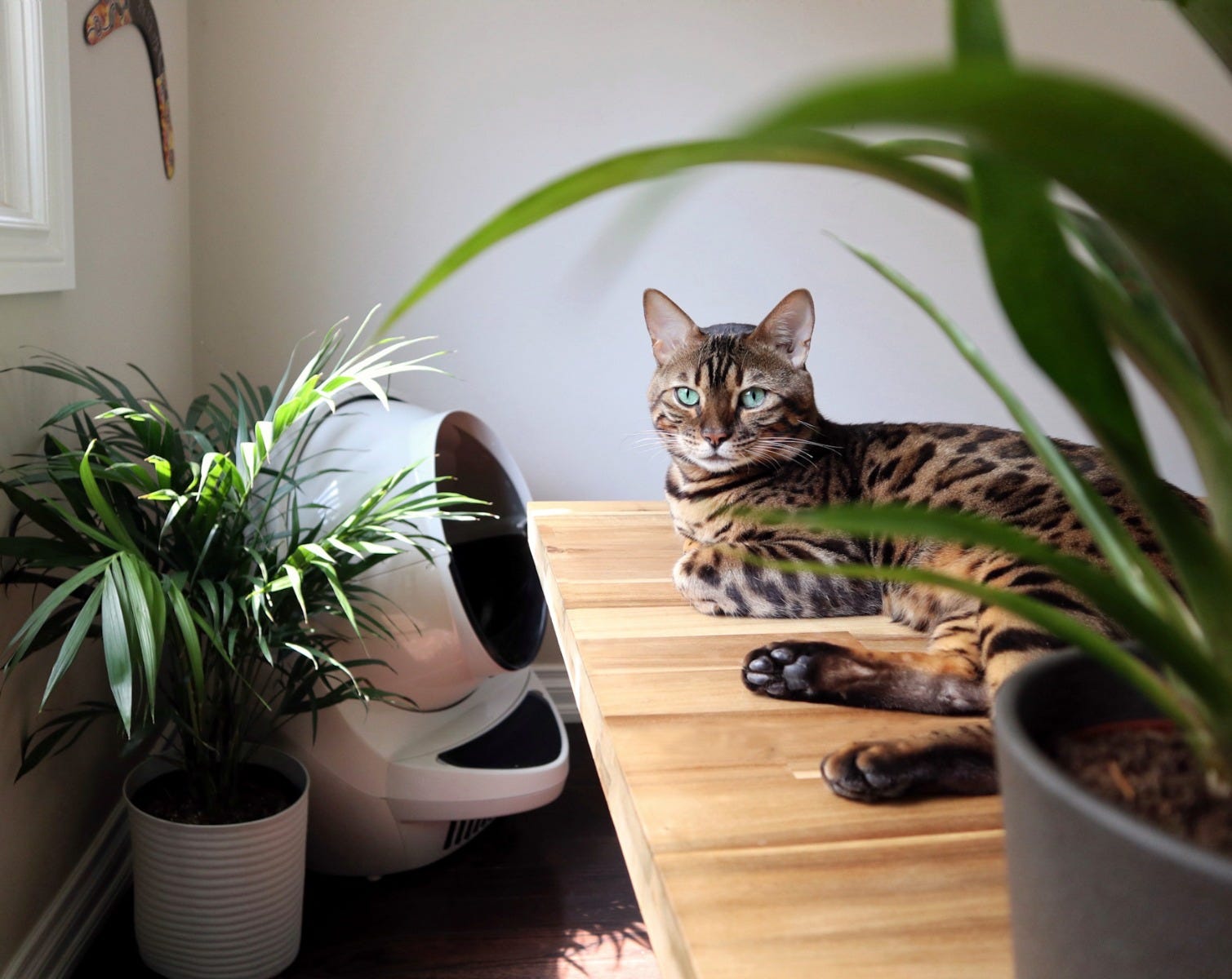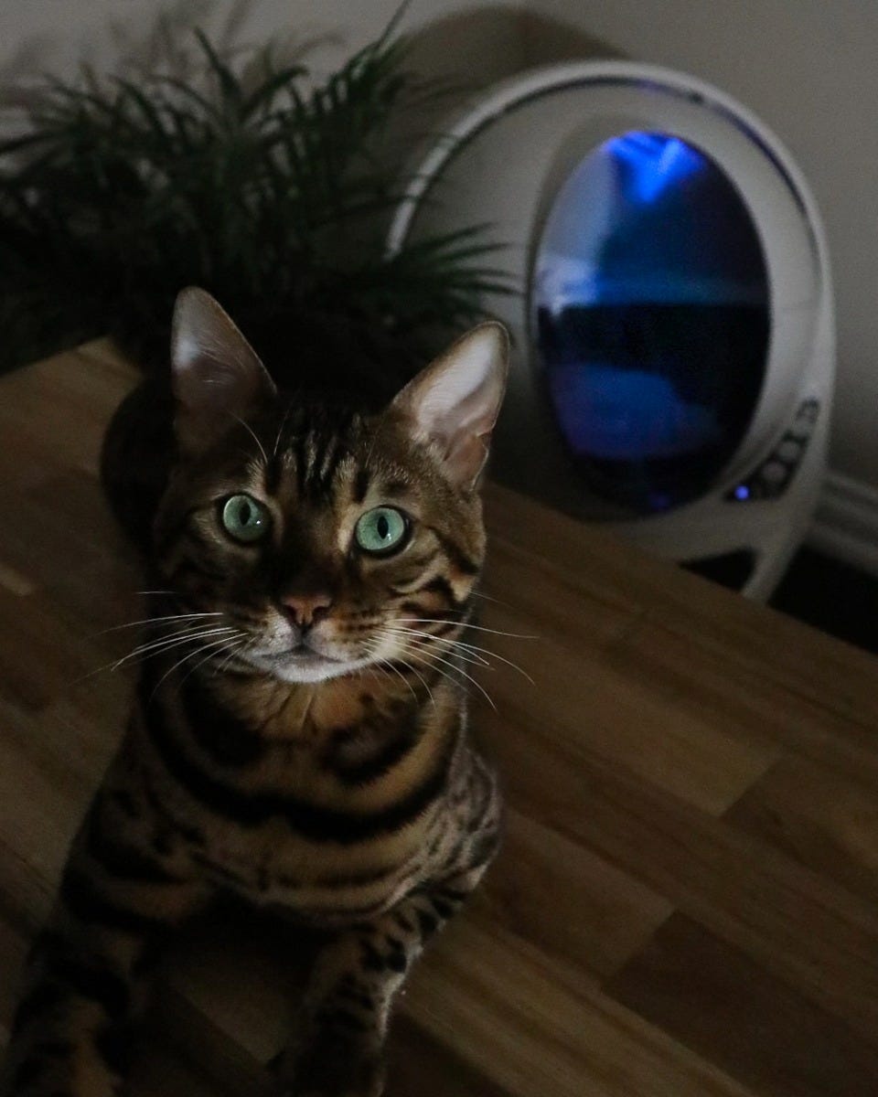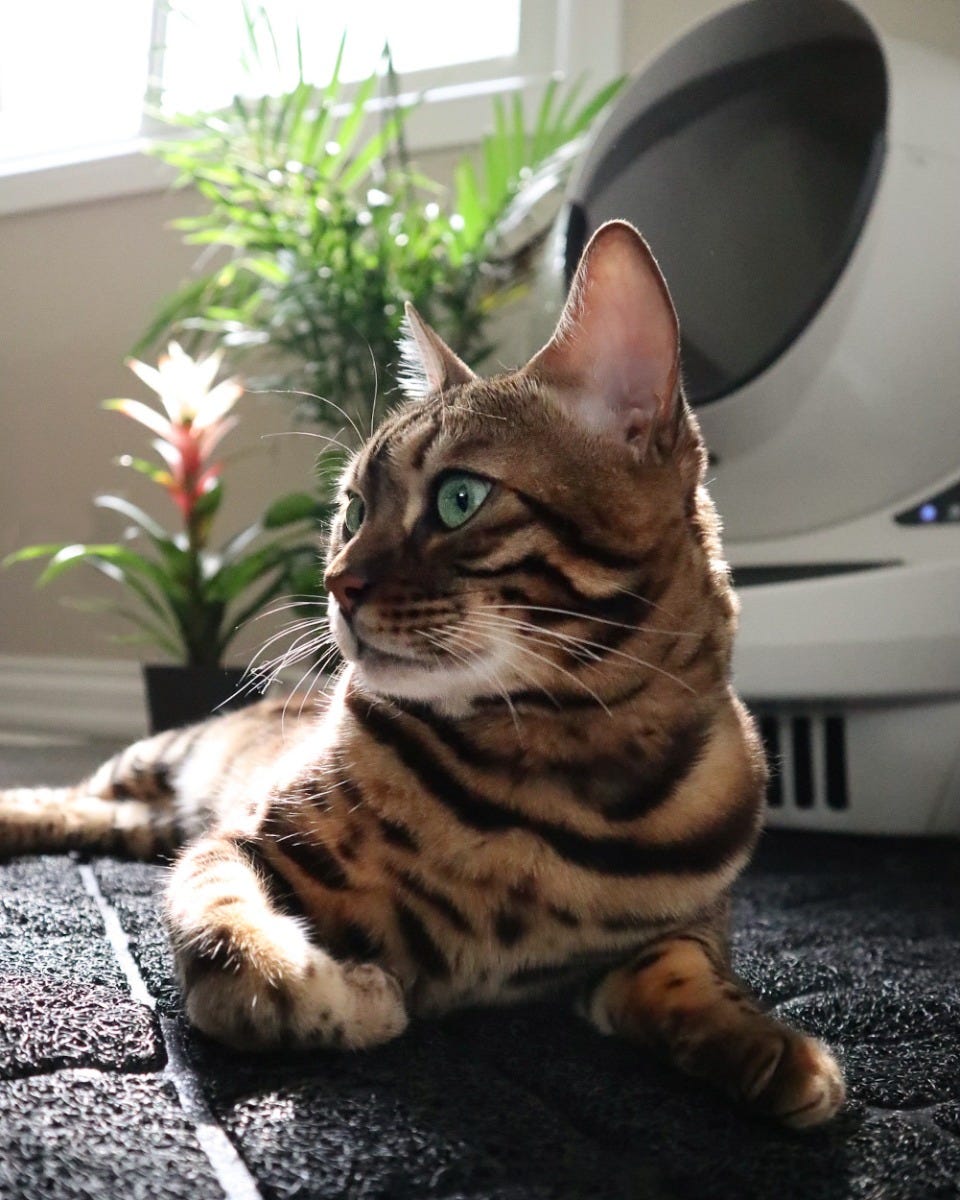 Bengal cat leaving after using Litter-Robot 3 in living room.