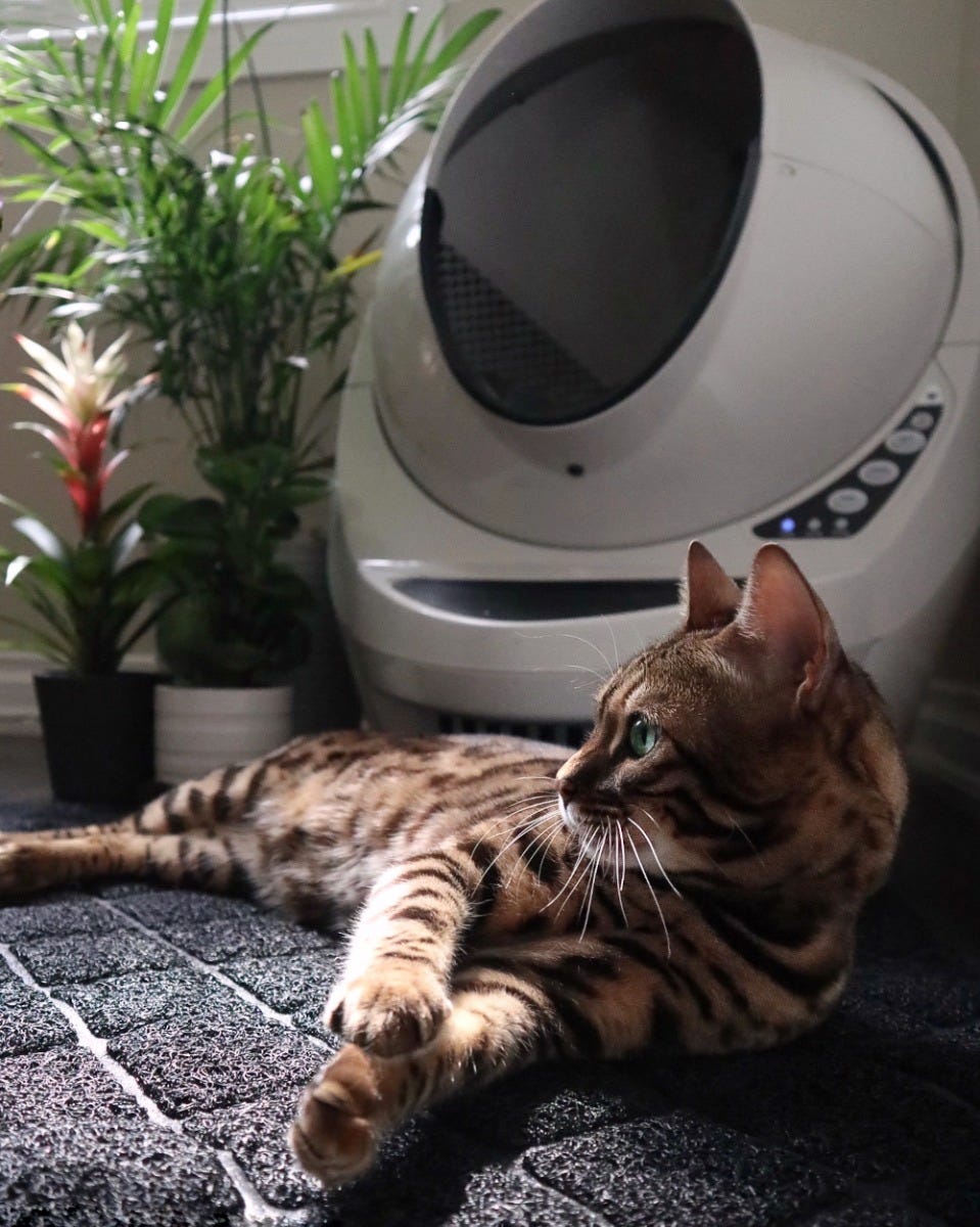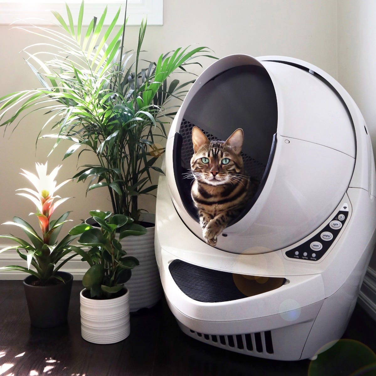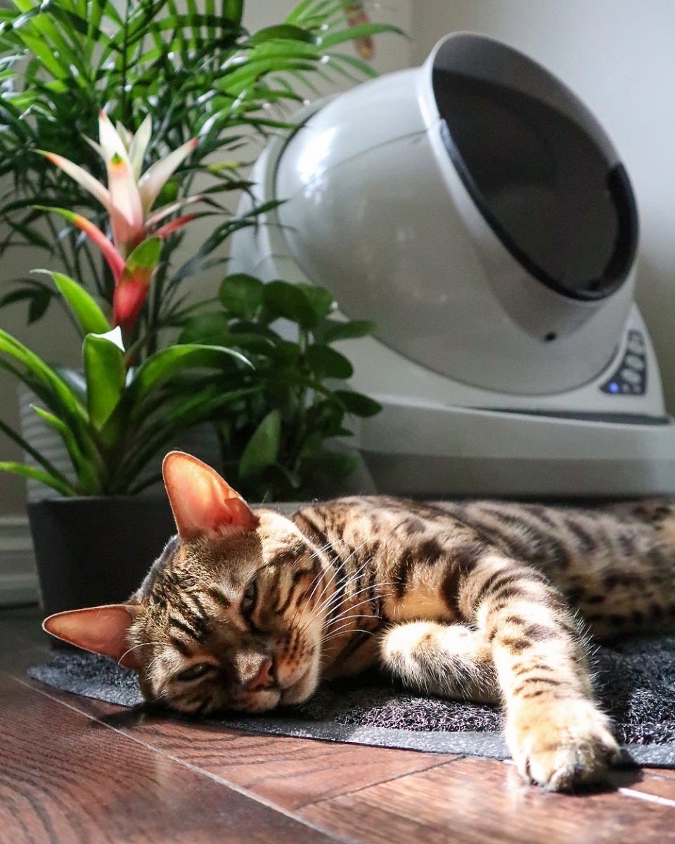 Litter-Robot 3 keeps tabby cat happy and matches your home decor.