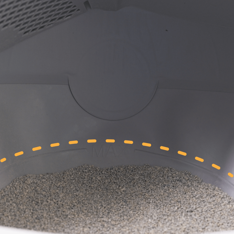 Fill the globe through the opening until the litter meets the raised fill line when spread flat (about 10 lbs or 1 gallon by volume). Be careful not to overfill the globe.