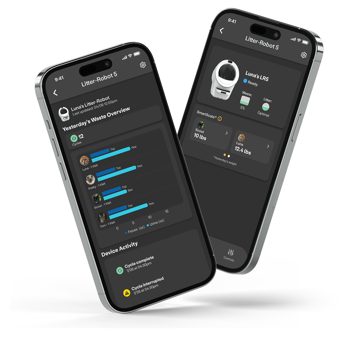 Litter-Robot 5 Pro is equipped with dual 1080p HD cameras—front-facing and inner-facing—that let you monitor your cats from anywhere. Basic camera features such as real-time video streaming and recorded events are included for free within the Whisker app.
