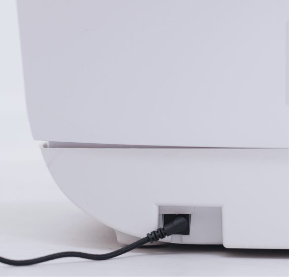 Plug the small end of the power supply into the socket on the back of the base. Then plug the AC/DC adapter into a wall outlet. Locate and press the Power button. Litter-Robot will display a solid white light indicating it is ready for use.