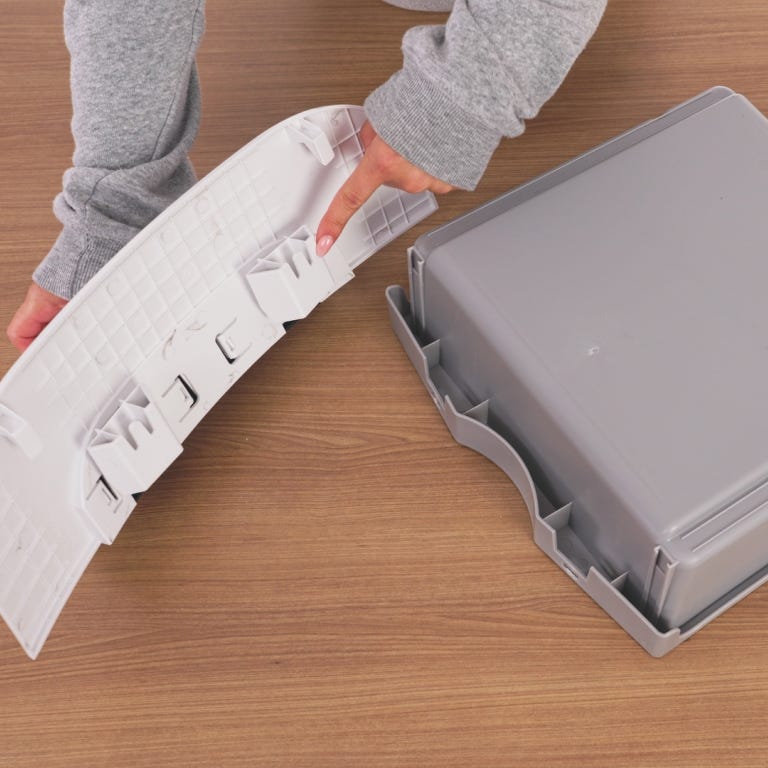 Match the hooks and tabs with the corresponding slots on the drawer body. Slide the drawer front onto the drawer body. While holding the tabs in place, flip the drawer so that it’s facing right side up. Push the drawer body down slightly until you hear or feel the clips snap into place.