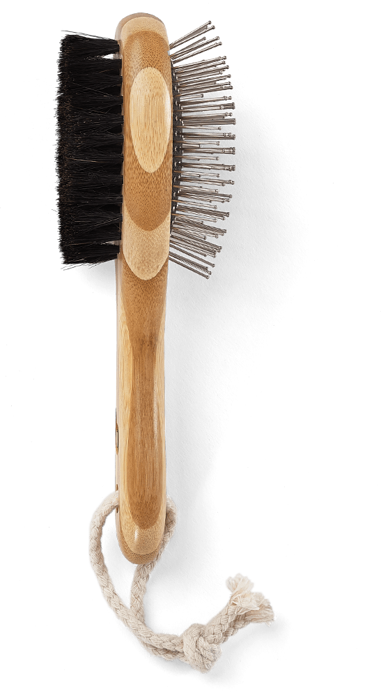 This small double-sided brush is made from natural bamboo, pure boar bristles, and metal pins. Product and/or packaging logos may appear modified in person.How often should I brush my cat?