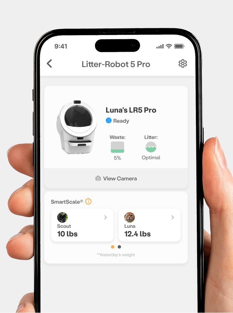 Stop scooping, experience superior odor control, and get in-depth insights with Litter-Robot 5 Pro. The integrated dual camera system allows for real-time streaming, recording, and cat identification* using AI-powered facial recognition, designed for homes with up to 5 cats.