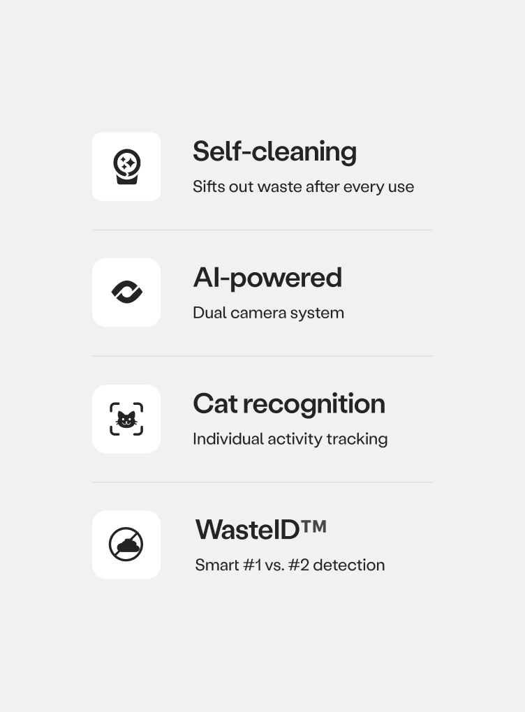 Both Litter-Robot 5 models, our latest generation, are designed for multi-cat homes, kittens as small as 3 lbs, and large cats up to 30 lbs. They are the same size and offer best-in-class technology, including WasteID™, an industry-first feature that distinguishes between urine and feces. Litter-Robot 5 Pro includes an integrated dual camera system for advanced cat identification and richer individual insights. This means you’ll be able to see which cat is using the unit and access more detailed data. Note that some features become more accurate over time as they learn from your household, typically optimizing after 30 days of regular use. (Some features require Whisker+.)