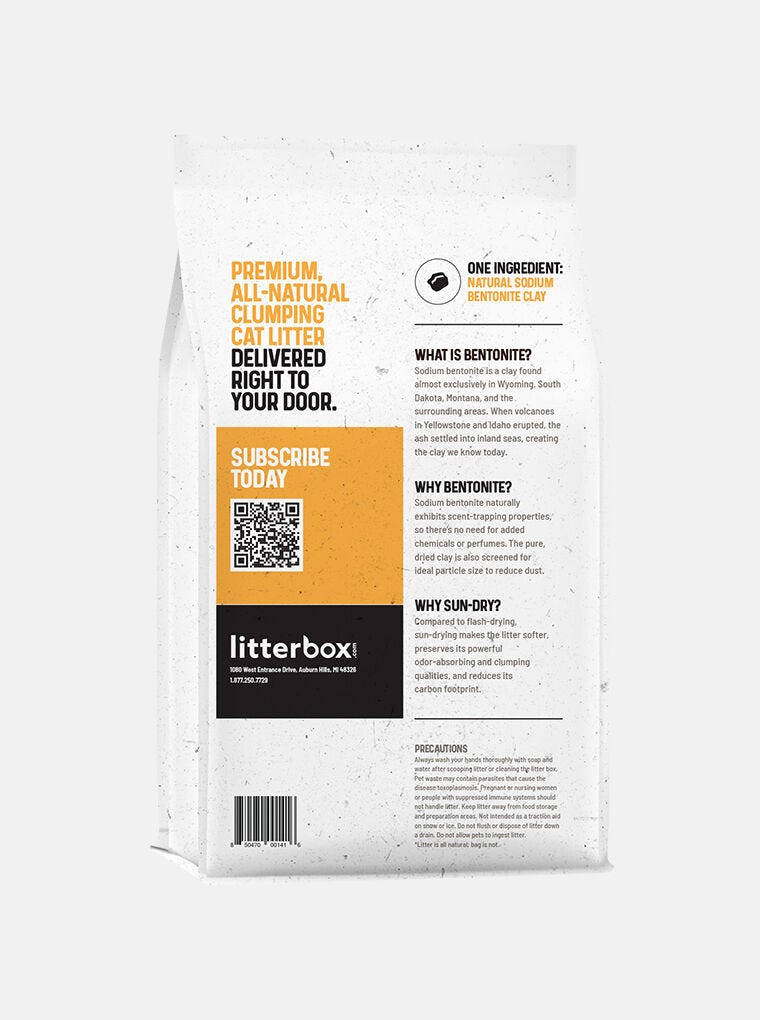 Typically, one 20-lb. bag of litter per cat will last one month. Our litter lasts longer than many other brands because our sun-dried clay is known for its superior ability to absorb liquids and clump quickly. This results in tighter clumps and less litter used. How long a bag of litter lasts also depends on how many cats you have, their size and waste habits, and what type of litter box they use. For example, a self-cleaning litter box like the Litter-Robot helps reduce litter usage by up to 50% as compared to scooping a traditional litter box.How do I start a subscription?